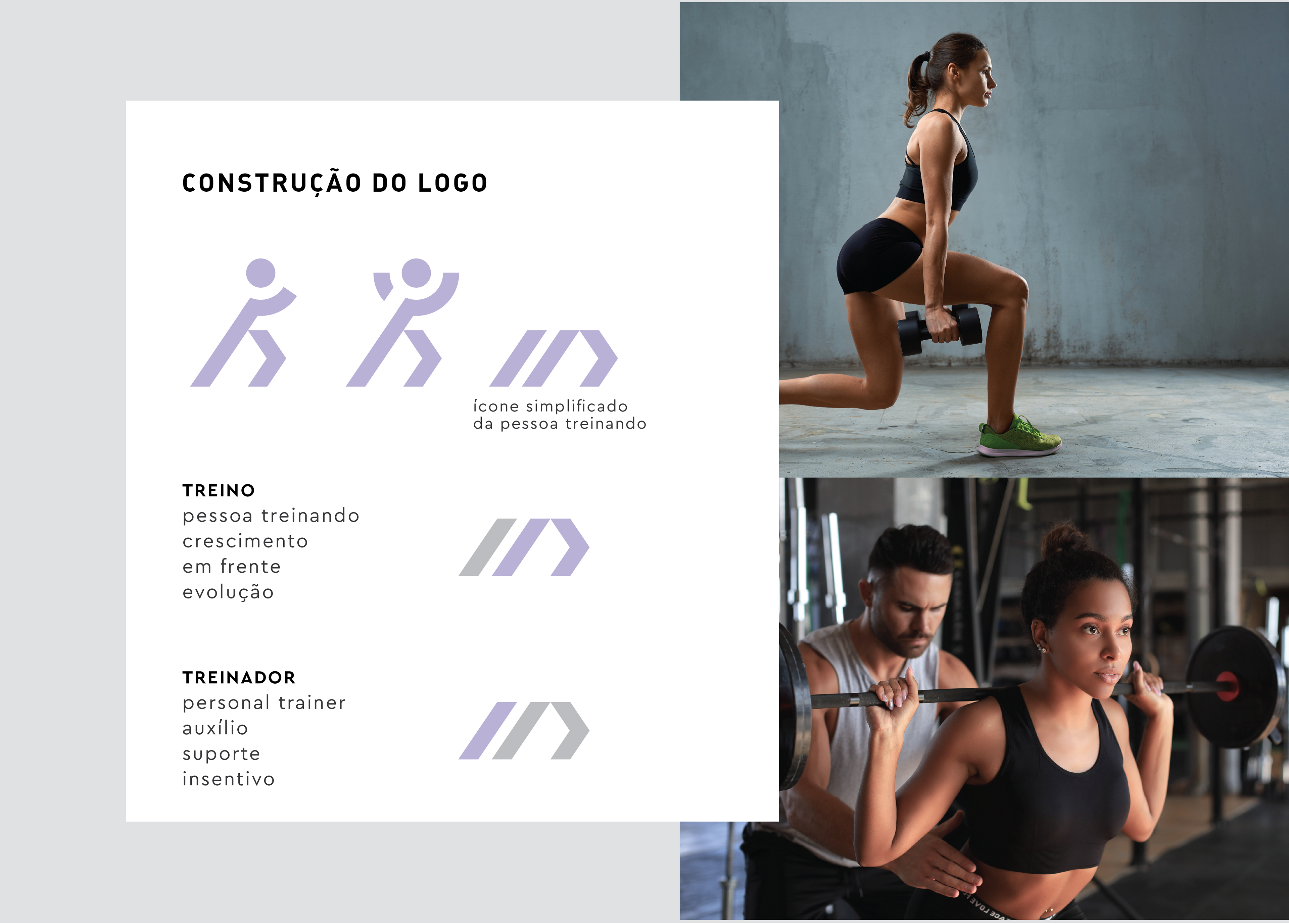 O ícone foi desenvolvido a partir de uma representação abstrata da relação entre aluno e personal trainer. O primeiro traço simboliza o auxílio, a presença e o suporte do treinador, enquanto os dois traços seguintes constroem a figura de uma pessoa em movimento, fazendo alusão a uma perna estendida e outra flexionada durante o exercício. Todos os traços são inclinados para frente, reforçando visualmente a ideia de deslocamento, mudança e progresso. As formas repetidas, angulares e direcionais criam uma sensação clara de fluxo, remetendo a trajetórias e ciclos de movimento. Essa repetição sustenta, de maneira simbólica, os conceitos de disciplina, constância e consistência, pilares fundamentais do trabalho de uma personal trainer.